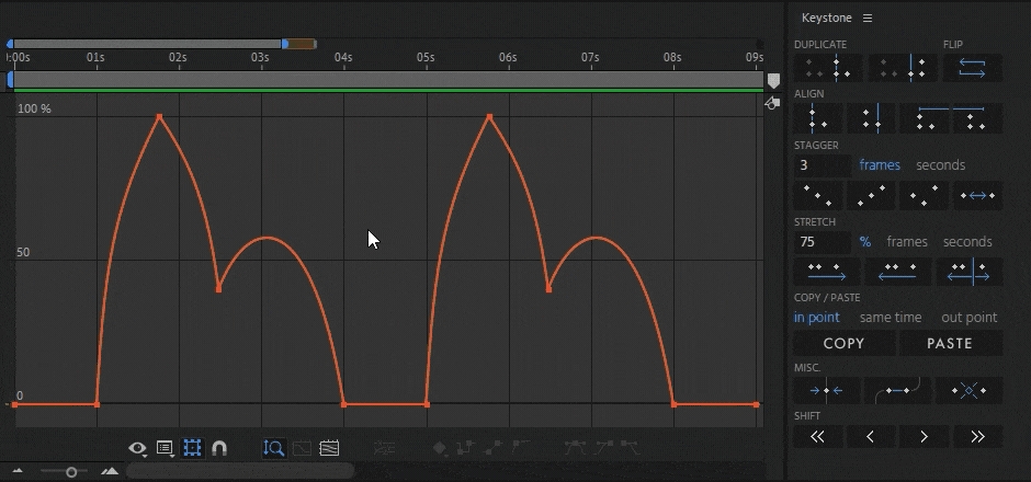 Below is a comparison of how keyframe easing is handled by After Effects (left) and Keystone (right). The curves are much better preserved by Keystone 2 than by After Effects.